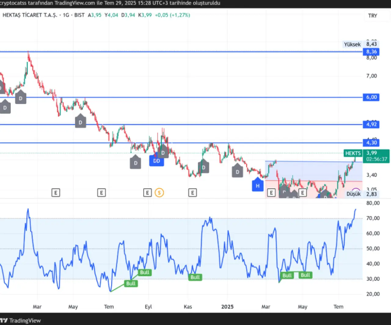 Borsa İstanbul'da uzun süredir baskı altında kalan Hektaş Ticaret T.A.Ş. (HEKTS), 29 Temmuz 2025 itibarıyla 3,99 TL seviyesinden işlem görüyor. Hisse, haftalardır süren sıkışmayı yukarı yönlü kırarken teknik görünümde pozitif sinyaller veriyor.