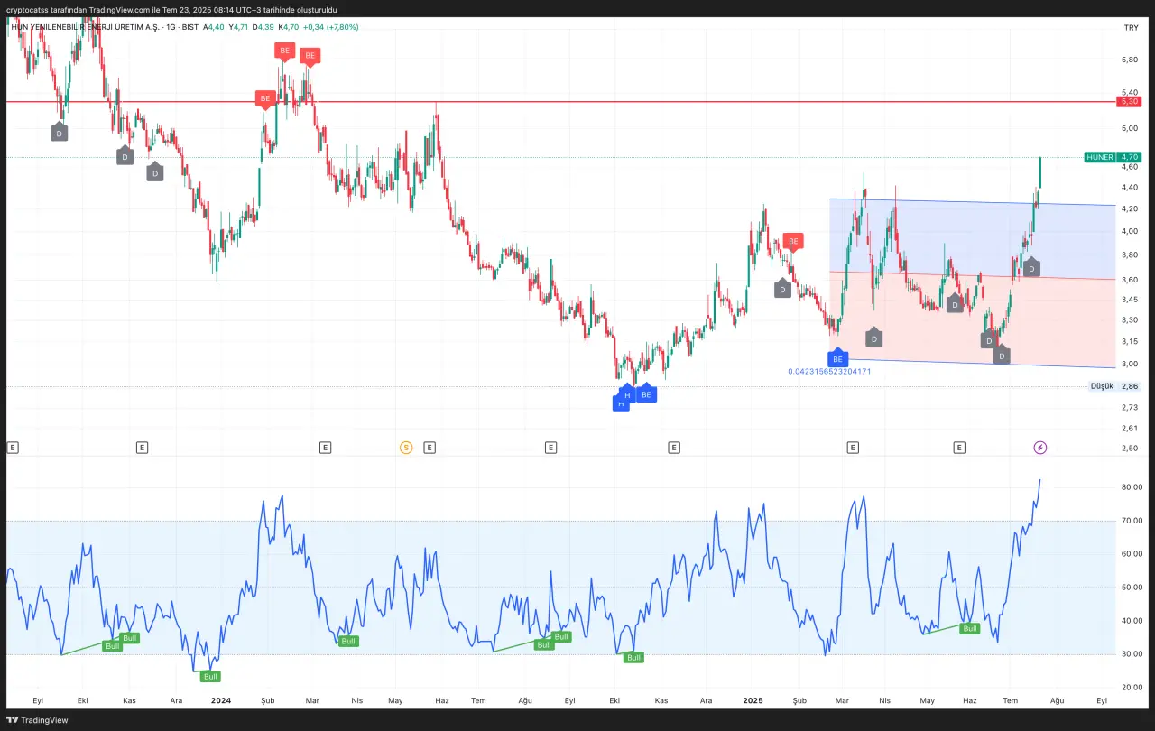Hun Yenilenebilir Enerji (HUNER) hissesi, 23 Temmuz 2025 tarihinde %7,8’lik güçlü bir yükselişle 4,70 TL seviyesine ulaştı. Teknik görünümde öne çıkan çanak formasyonu dikkat çekerken, hisse tarihi direnç bölgesine adım attı.