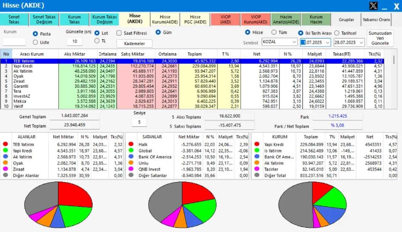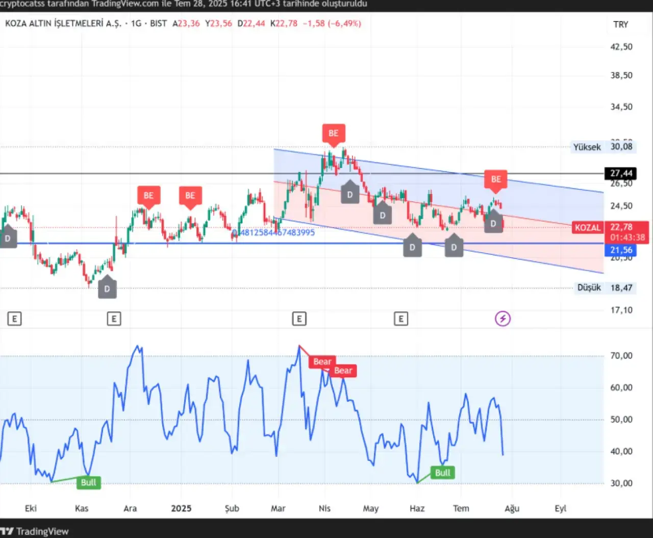 Koza Altın İşletmeleri A.Ş. (KOZAL) hissesi, 28 Temmuz 2025 işlem gününde %6,49 değer kaybederek 22,78 TL seviyesine geriledi. Sert satışlarla birlikte teknik göstergeler olumsuz sinyaller üretmeye devam ederken, hisse fiyatı düşüş kanalının alt bandına doğru yaklaşmaya başladı.
