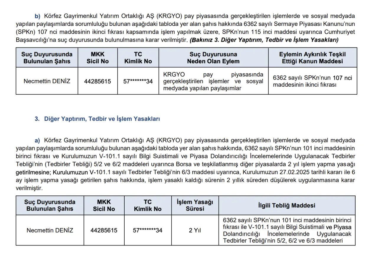 SPK tarafından yayımlanan karara göre, Necmettin Deniz’in KRGYO hisselerinde gerçekleştirdiği işlemler ve sosyal medyadaki paylaşımları, 6362 sayılı Sermaye Piyasası Kanunu’nun (SPKn) 107. maddesinin ikinci fıkrası kapsamında suç teşkil etti. Bu nedenle SPKn’nun 115. maddesi uyarınca Cumhuriyet Başsavcılığı’na suç duyurusunda bulunulmasına karar verildi.