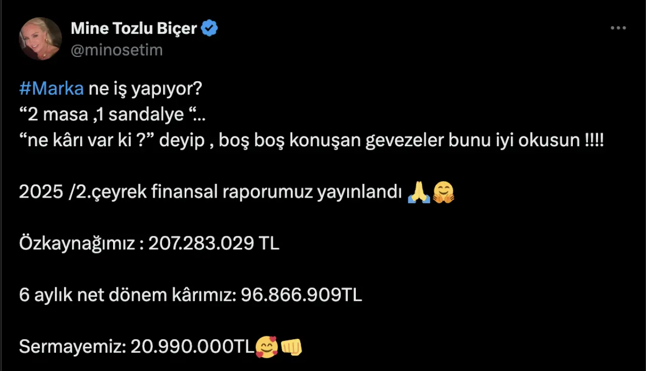 Marka Yatırım Holding, 2025 yılı ikinci çeyrek finansal sonuçlarını açıkladı. Yönetim Kurulu Başkanı Mine Tozlu Biçer, bilanço sonrası yaptığı değerlendirmede şirketi küçümseyenlere göndermede bulunarak, “2 masa 1 sandalye, ne kârı var ki?” diyenlere artık rakamlarla cevap verildiğini söyledi.