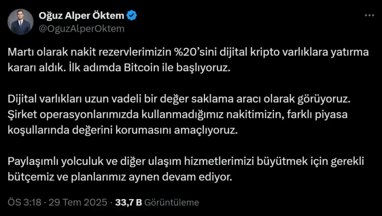 “Dijital varlıkları uzun vadeli bir değer saklama aracı olarak görüyoruz. Şirket operasyonlarımızda kullanmadığımız nakitimizin, farklı piyasa koşullarında değerini korumasını amaçlıyoruz.”