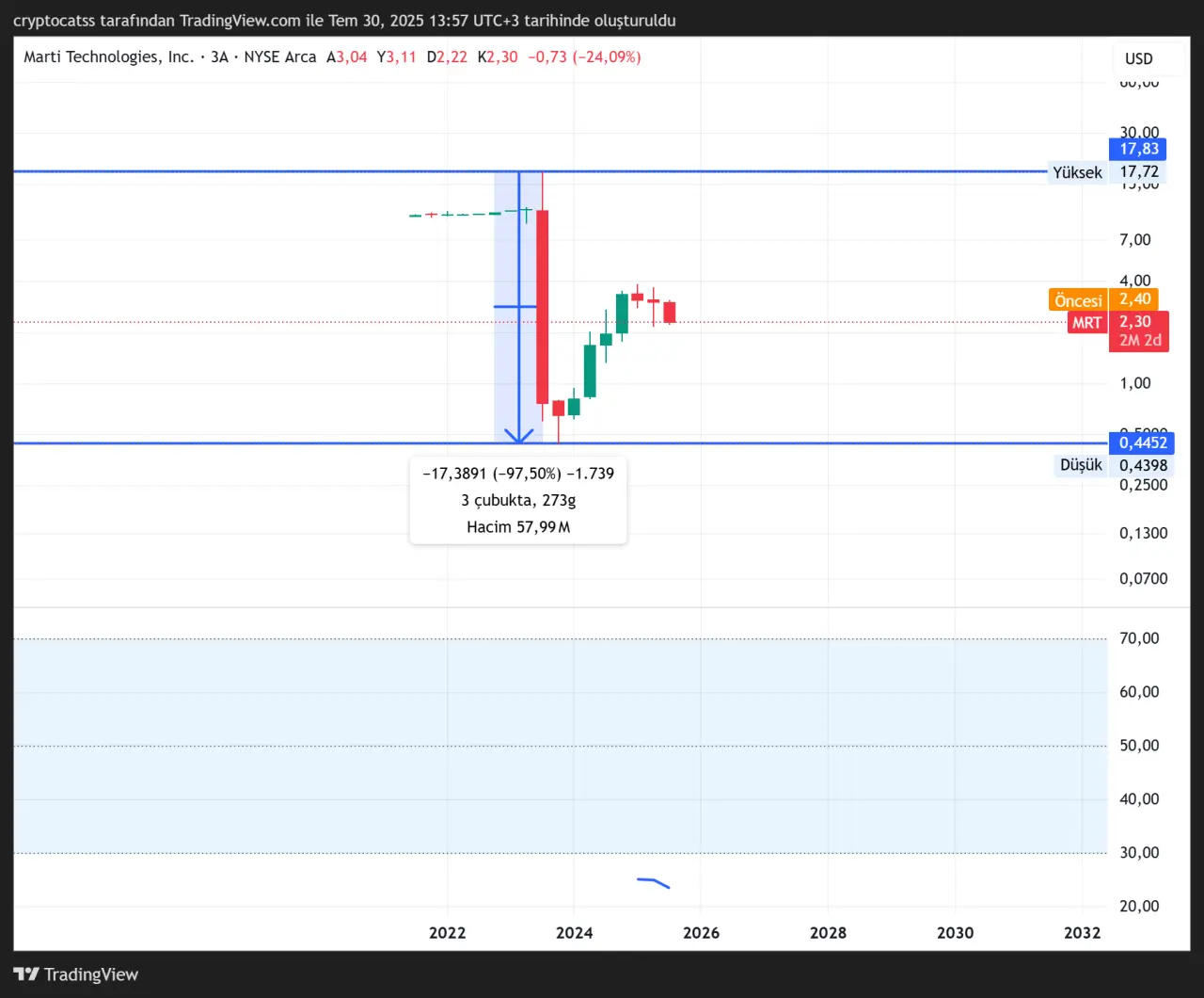 Martı Technologies, 3 Temmuz 2023 tarihinde New York Stock Exchange (NYSE)’te MRT koduyla işlem görmeye başladı. İlk işlem günlerinde ulaştığı en yüksek seviye 17,73 USD oldu. Ancak o tarihten itibaren hisse fiyatı sürekli düşüş gösterdi.