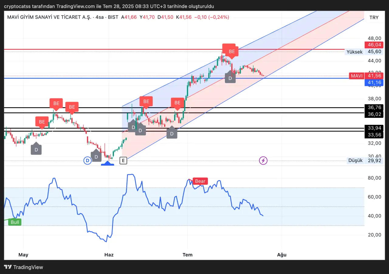 Mavi Giyim Sanayi ve Ticaret A.Ş. (BIST: MAVI) hissesi, son işlemlerde 41,56 TL seviyesine gerileyerek yükselen kanal formasyonunun alt bandına temas etti. Teknik analiz verilerine göre bu destek seviyesi korunamazsa, düşüşün derinleşme riski bulunuyor.