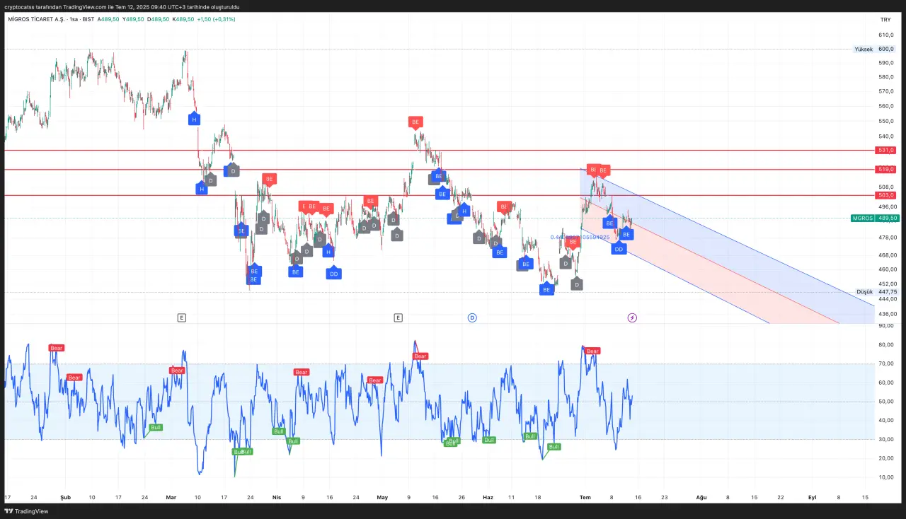 Migros Ticaret A.Ş. (MGROS) hissesi, Temmuz ayı ortasında düşen kanal içinde hareketini sürdürürken 489,50 TL seviyesinden günü yatay artıda tamamladı. Hisse üzerinde satış baskısı devam ederken teknik göstergeler kısa vadede yön arayışına işaret ediyor.