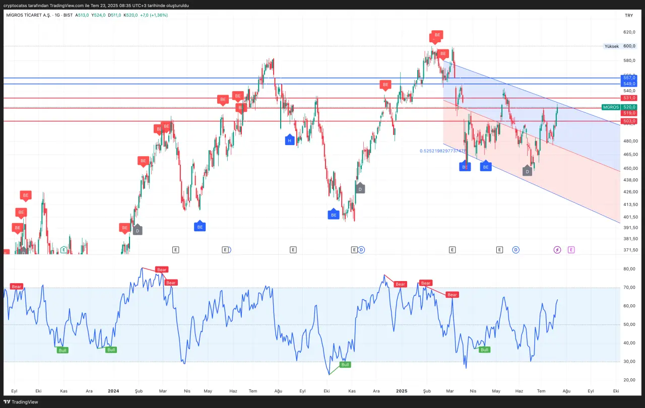 23 Temmuz 2025 tarihinde Migros Ticaret A.Ş. (MGROS) hissesi %1,36 yükselerek 520 TL seviyesine ulaştı. Son haftalarda güçlenen teknik görünüm, hisseyi düşen kanalın üst bandına kadar taşıdı. Bu aşamada, teknik açıdan en kritik direnç seviyesi olarak 531 TL öne çıkıyor.