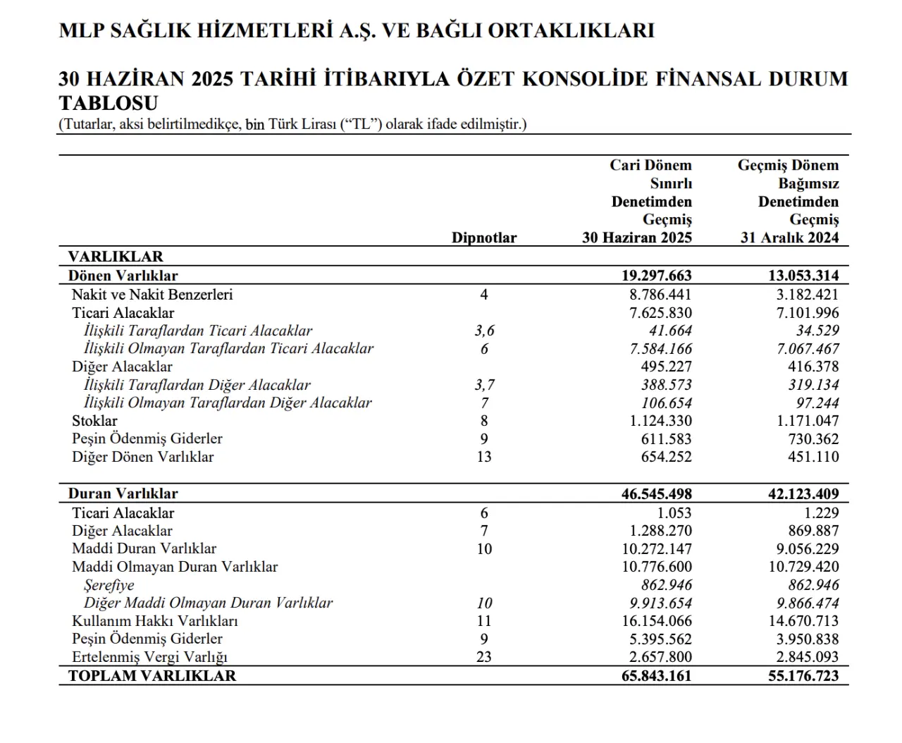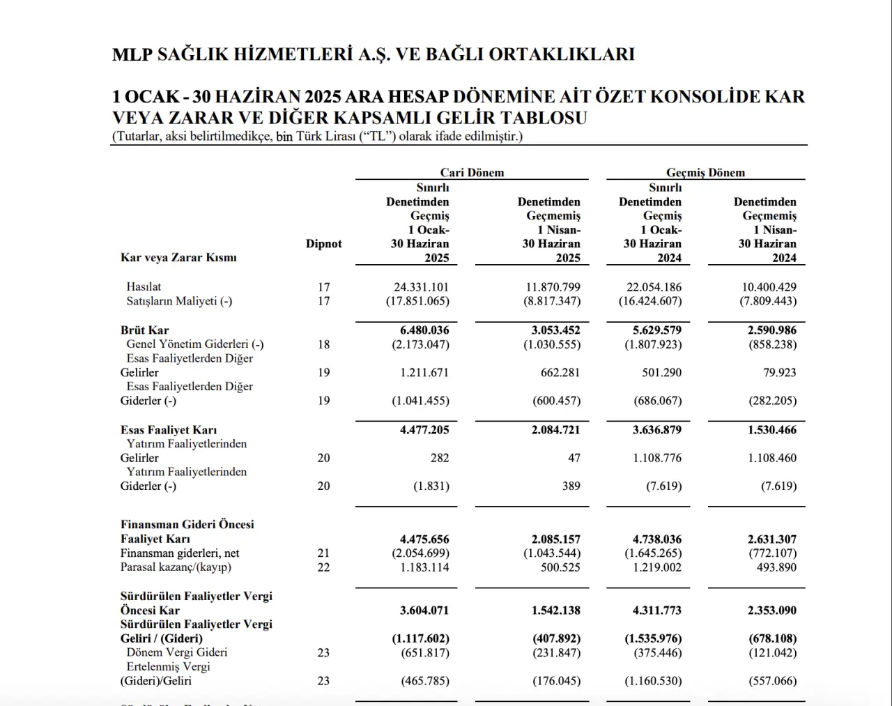 MLP Sağlık Hizmetleri A.Ş. (BIST: MPARK), 1 Ocak – 30 Haziran 2025 dönemine ilişkin finansal sonuçlarını Kamuyu Aydınlatma Platformu’na (KAP) açıkladı. Şirketin bu dönemdeki gelirleri, nakit varlıkları ve faaliyet kârlılığı güçlü bir seyir izlerken; özellikle yüksek yatırım harcamaları, artan finansman giderleri ve düşen net kâr marjı, dikkatle izlenmesi gereken başlıklar olarak öne çıktı.