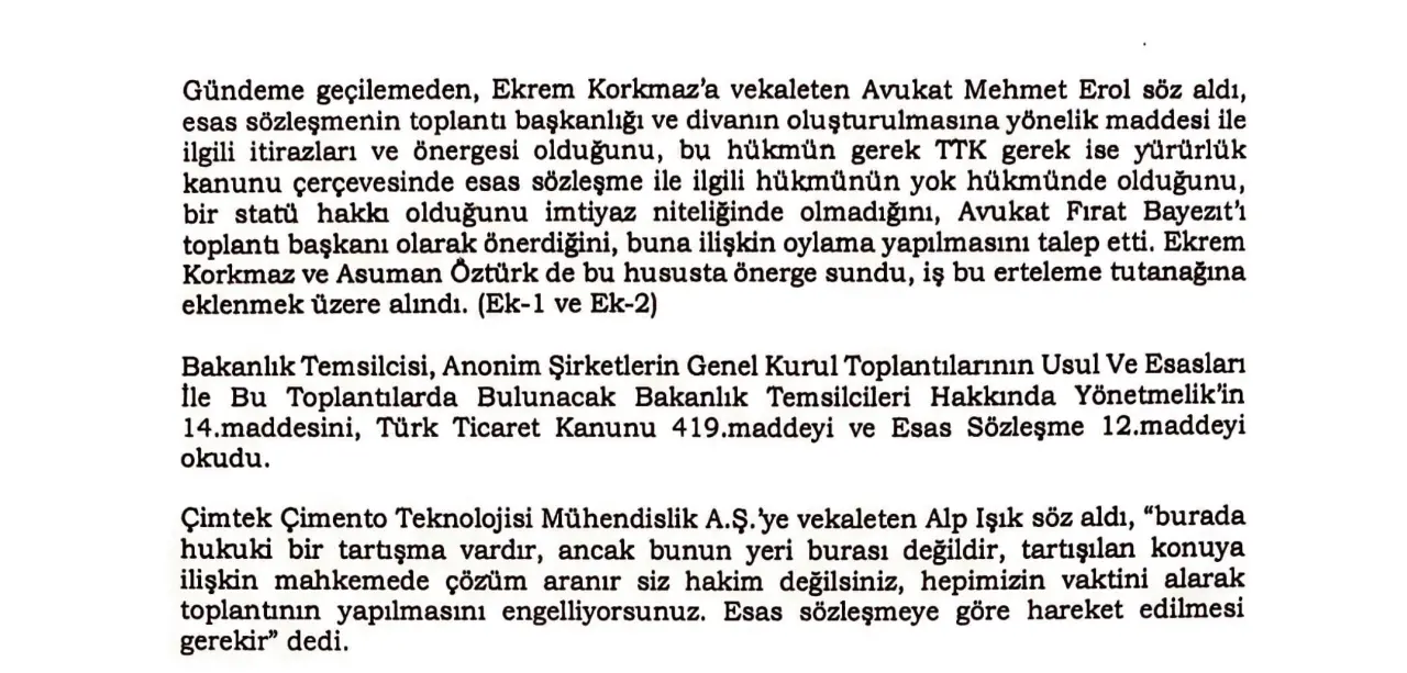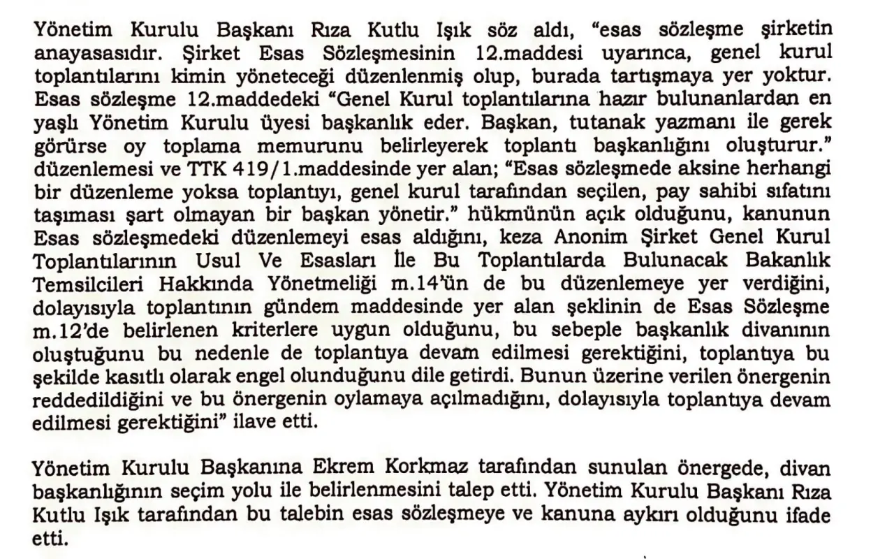 25 Nisan’da azlık pay sahibi talebiyle ertelenen ilk toplantı, 28 Mayıs’ta fiziki yetersizlik gerekçesiyle sonlanmıştı. Son toplantıda ise divan başkanlığı seçimi üzerinden çıkan tartışmalar, toplantının fiilen başlamasını engelledi. Azlık pay sahipleri, şirketin esas sözleşmesinin 12. maddesinin tartışmalı biçimde uygulandığını savundu ve toplantı başkanının genel kurul tarafından seçilmesini talep etti.