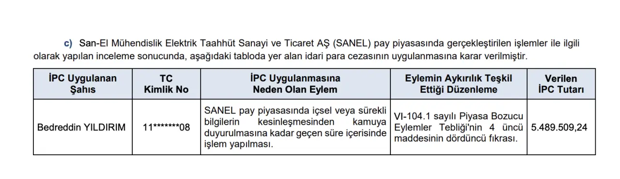 SPK kararına göre Bedreddin Yıldırım, SANEL pay piyasasında içsel veya sürekli bilgilerin kesinleşmesinden kamuya duyurulmasına kadar geçen süre içerisinde işlem yaptı. Bu durum, VI-104.1 sayılı Piyasa Bozucu Eylemler Tebliği’nin 4. maddesinin dördüncü fıkrasına aykırılık teşkil etti.
