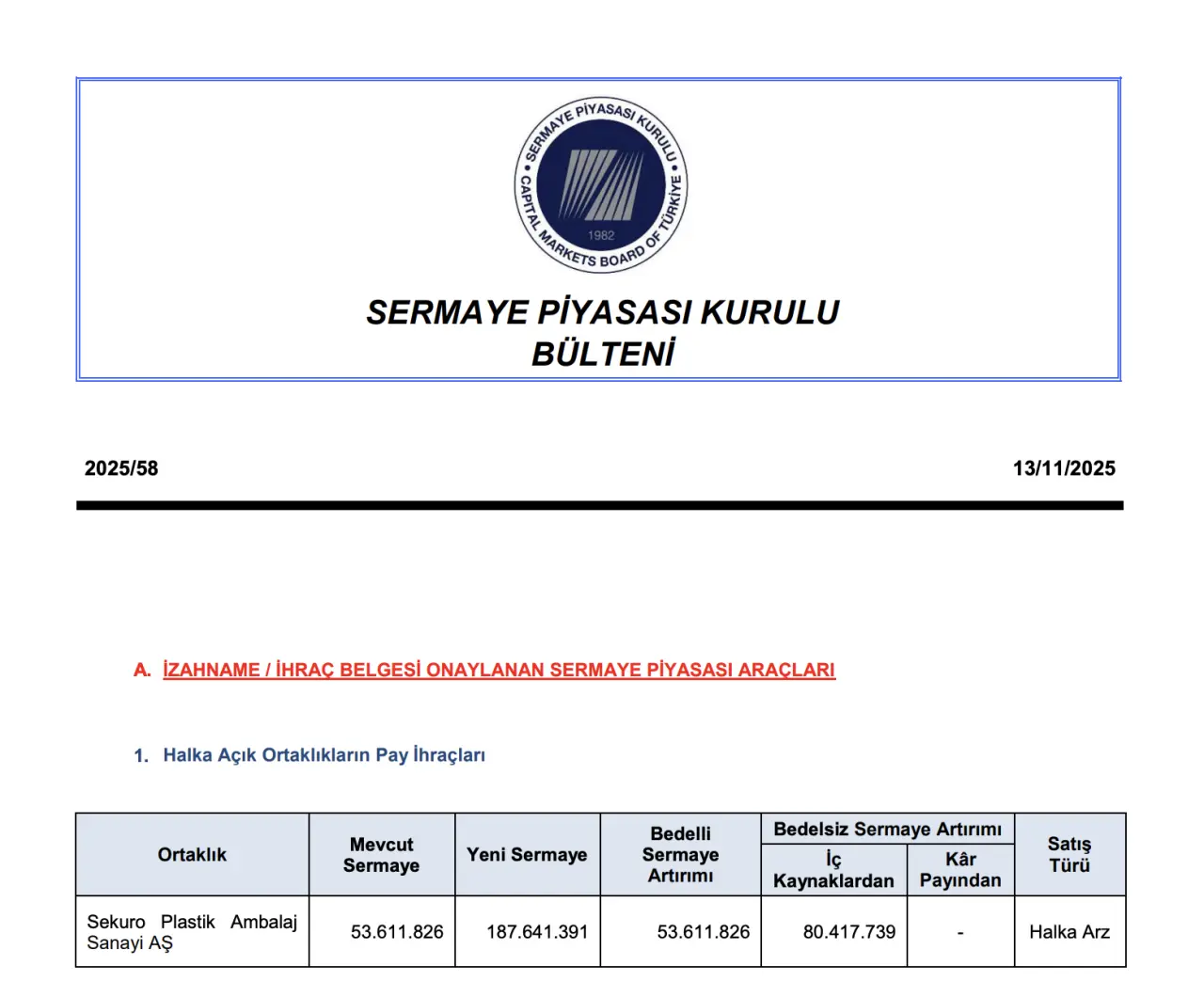 Sermaye Piyasası Kurulu’nun (SPK) 13 Kasım 2025 tarihli 2025/58 sayılı bülteninde, Sekuro Plastik Ambalaj Sanayi AŞ’nin sermaye artırımı başvurusu onaylandı. Buna göre şirket hem %100 bedelli hem de %150 bedelsiz olmak üzere toplam %250 oranında sermaye artırımı gerçekleştirecek. Açıklanan rakamlar, şirket sermayesinde önemli bir genişlemeye işaret ediyor.