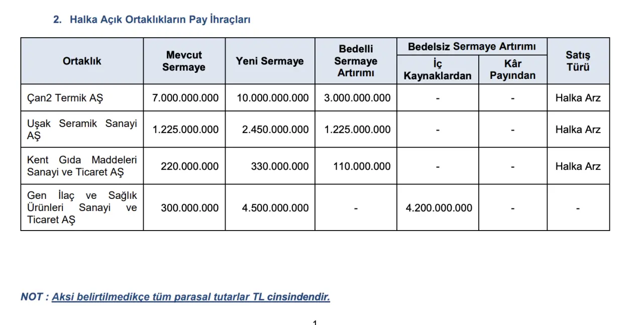 Kent Gıda Maddeleri Sanayi ve Ticaret AŞ ise mevcut 220 milyon TL olan sermayesini 330 milyon TL’ye çıkaracak. Şirket, 110 milyon TL bedelli sermaye artırımı gerçekleştirecek.