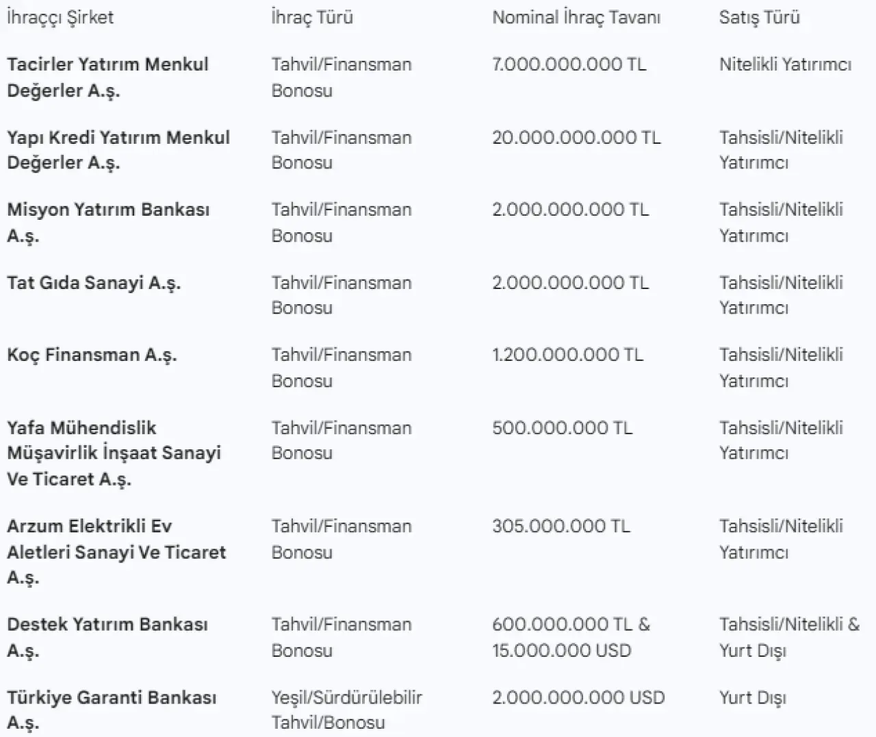 Yayımlanan bültene göre, şirketler nakit akışlarını yönetmek ve operasyonel maliyetlerini karşılamak amacıyla tahvil ve finansman bonosu ihraç edecek. Onay alan kurumlar arasında bankacılık, gıda ve sanayi sektörünün öncü isimleri yer alıyor. Özellikle Türkiye Garanti Bankası, 2 milyar ABD Doları tutarındaki yurt dışı borçlanma tavanıyla listede dikkat çeken en yüksek tutarlı onayı alan kurum oldu.