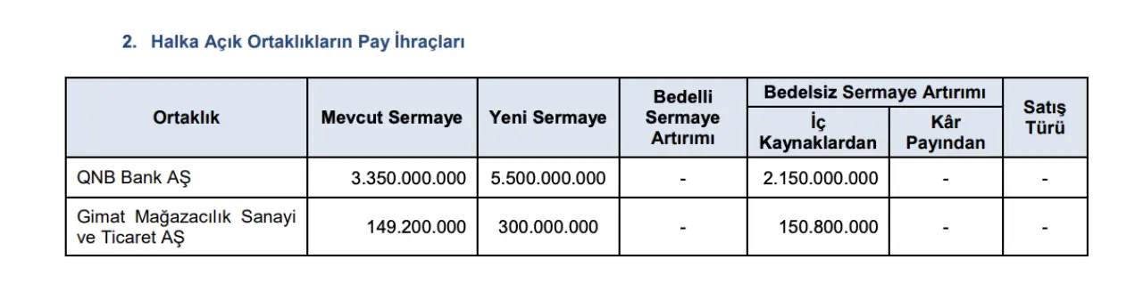 Sermaye Piyasası Kurulu (SPK), son bülteninde iki halka açık şirketin bedelsiz sermaye artırımı başvurusuna onay verdi. Karara göre QNB Bank AŞ ve Gimat Mağazacılık Sanayi ve Ticaret AŞ, sermayelerini iç kaynaklardan karşılanacak şekilde artıracak.