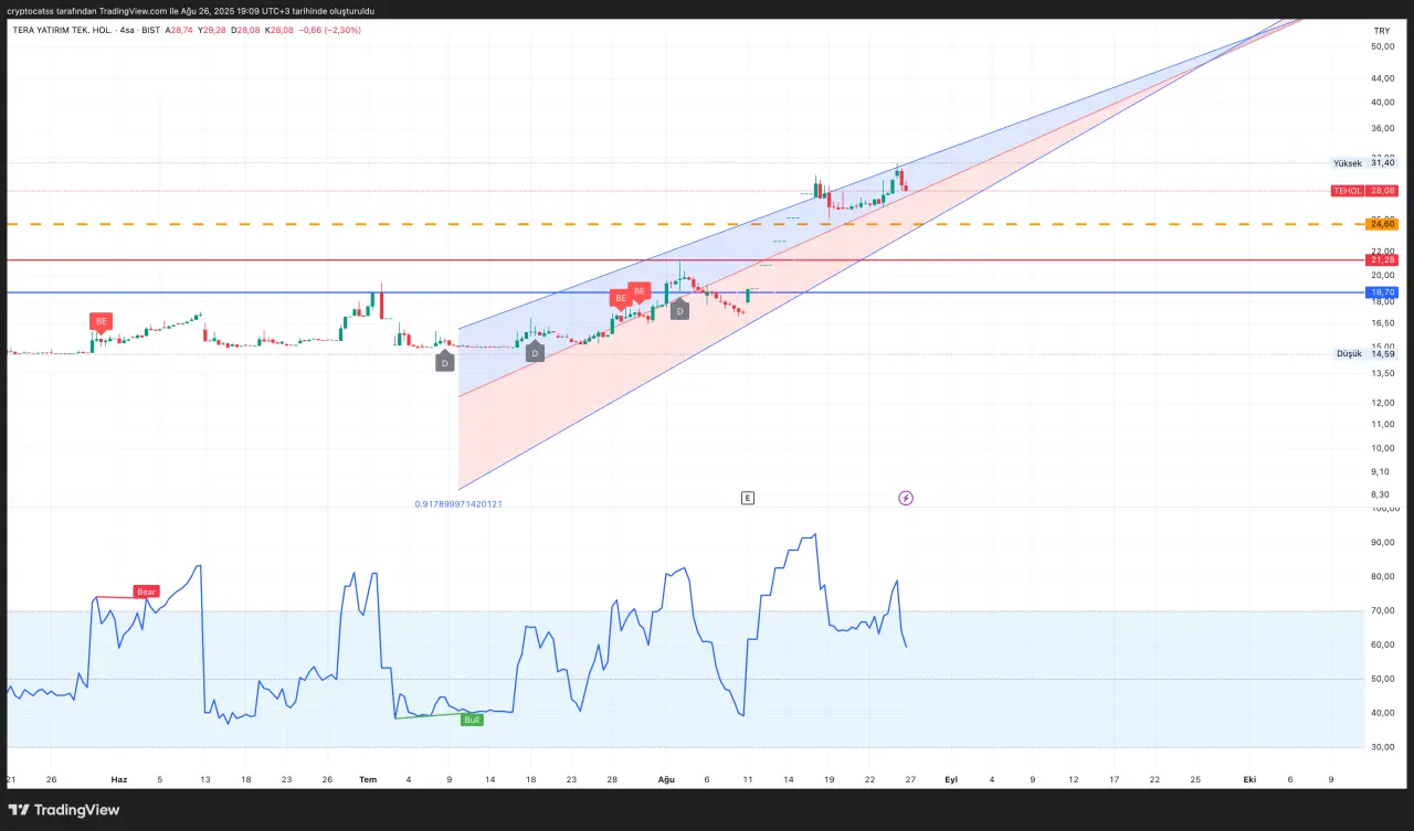 TEHOL şu an yükseliş kanalını korusa da 28 TL seviyesindeki fiyat hareketi kritik. 31,40 TL’nin aşılması halinde trend hızlanabilir.