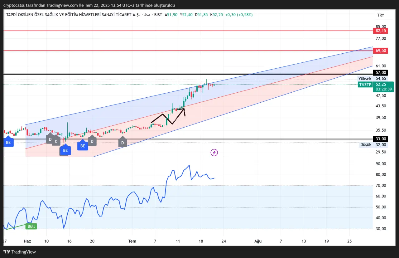 Tapdi Oksijen (#TNZTP), 4 saatlik grafikte belirgin bir yükselen kanal içinde hareket ediyor. Hisse, 52,25 TL seviyesinde işlem görüyor ve kanalın üst bandına yaklaşmış durumda.