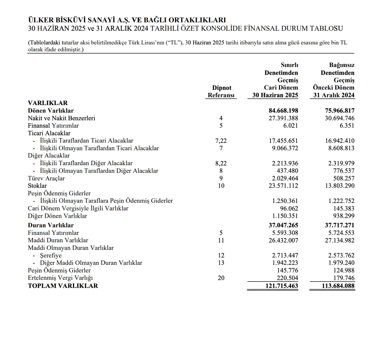 Ülker’in hasılatı 2025’in ilk yarısında 51,6 milyar TL olarak gerçekleşti. Geçen yıl aynı dönemde bu rakam 49,4 milyar TL idi. Brüt kâr 15,8 milyar TL ile yatay seyrederken, esas faaliyet kârı 8,6 milyar TL’ye geriledi (2024/6A: 9,6 milyar TL).