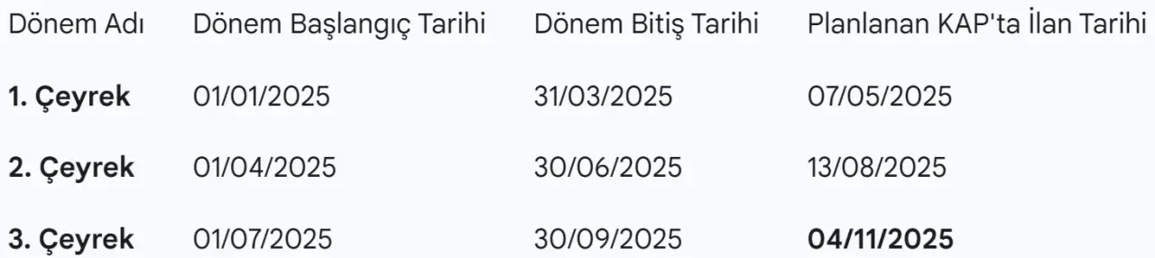 Holding tarafından yapılan açıklamaya göre, 30 Eylül 2025 tarihinde sona eren ara döneme ilişkin bağımsız denetimden geçmemiş finansal raporlar, 4 Kasım 2025 Salı günü Kamuyu Aydınlatma Platformu'nda (KAP) ilan edilecek. Açıklamanın saati ise seans sonrası olarak planlandı.