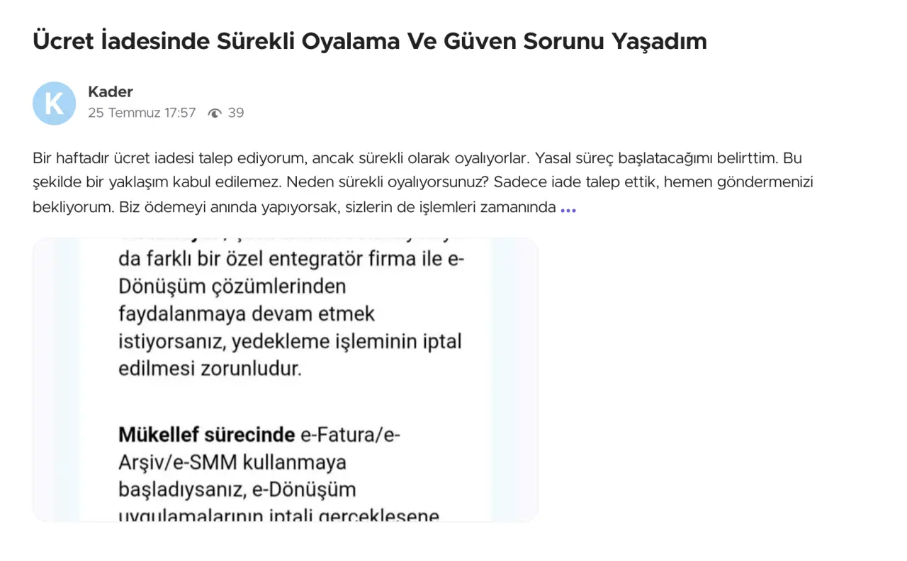 Bir diğeri (Kader), ücret iadesi talep ediyor, günlerce bekletiliyor. “Biz ödemeyi anında yapıyoruz, siz neden yapmıyorsunuz?” diyor. Haklı.
