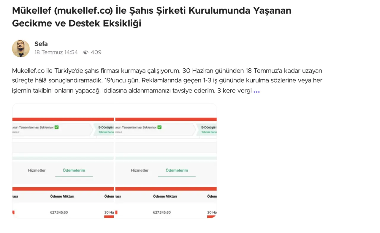 Bir kullanıcı (Sefa), Mükellef.Co ile şirket kurmaya çalışıyor. Sonuç? 3 kere vergi dairesine gitmiş, sistemler uyuşmuyor, muhasebeci yanlış yönlendiriyor, müşteri hizmetleri konudan bihaber.