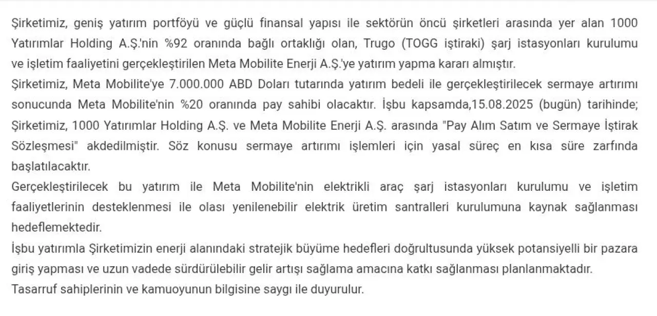 Tera Yatırım, bu hamleyi enerji ve mobilite sektörlerinde stratejik büyüme hedefleri doğrultusunda atılmış önemli bir adım olarak değerlendiriyor. Şirket, bu yatırım sayesinde yüksek potansiyelli bir pazara giriş yaparken, uzun vadede sürdürülebilir gelir artışı ve enerji ekosisteminde güçlü bir konum elde etmeyi amaçlıyor.